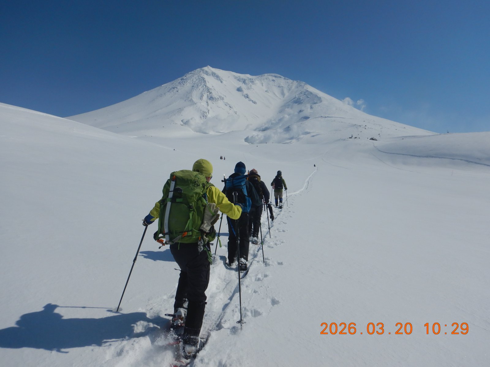 白銀荘に宿泊の山スキーツアーに行ってきました。家の事情で直前にキャンセルとなったМさんを除いてメンバーは5名。リーダーのIさんを先頭に初日の前十勝岳に出発しました。 スノーブリッジで沢を渡渉すると一直線の尾根登り、標高を上げるにつれ雪面はカリカリ状態となり、1400m手前で終了となりました。 スキーには向かないバーン状態でしたが、雄大な景色をバックに山スキーを楽しんできました。
