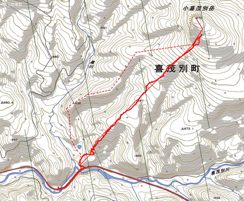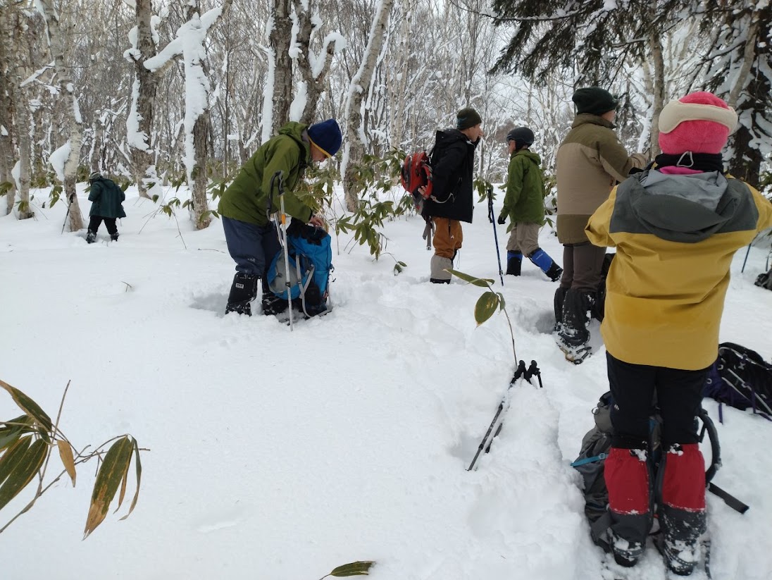ここ最近になってドカンと雪が降ったのでもう大丈夫かと思っていたが、まだまだ笹藪だらけでうっかりすると藪の隙間に埋まってしまいそうになる。全員でラッセルを交代して進んだが、慣れないスノーシューの歩行に苦労しペースも上がらず残念ながら山頂の手前930m付近で行動停止とした。