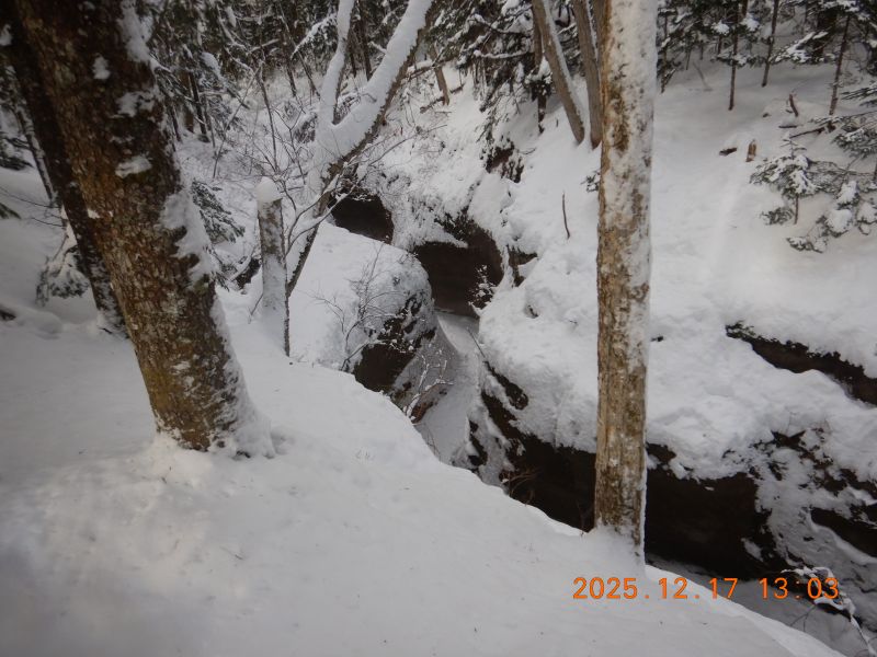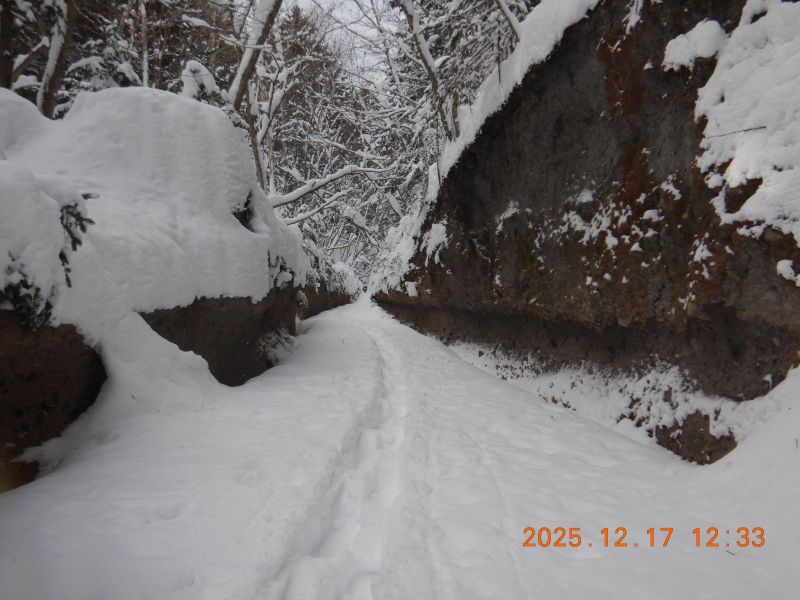 アイゼン歩行訓練をする目的で樽前山に向かった。かなり前から進入禁止となっている苔の洞門に沿ったルート。勿論トレースはないが、このところ高温気味だったので、雪が締まっていればという予想を裏切り、普通のラッセルとなるし雪は重い。洞門の左岸上は藪(笹&幼木&倒木など)がうるさく。歩行スピードにブレーキがかかる。ピーク到着予定時間になってもまだ樽前山のドームさえ見えない!やっと木立越しにチラッとドームが見えたところで、前進を諦め下山。背負ってきたアイゼン、ピッケルやロープが無駄に重かった。