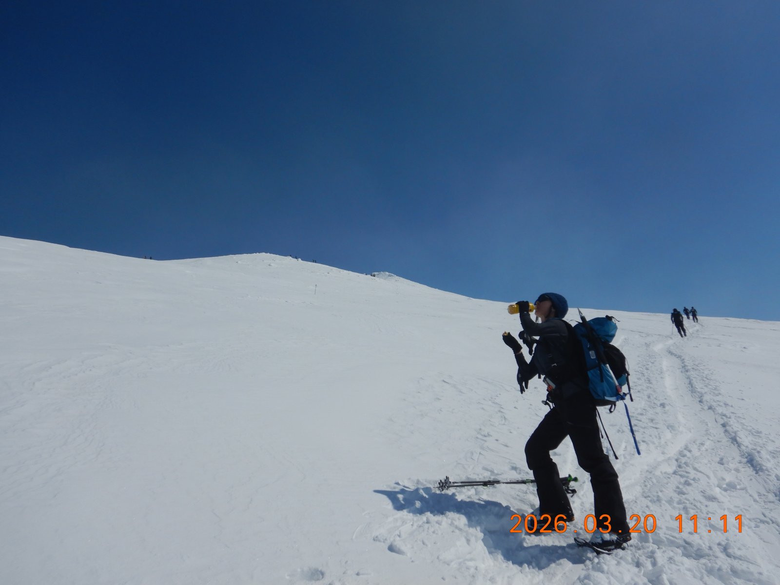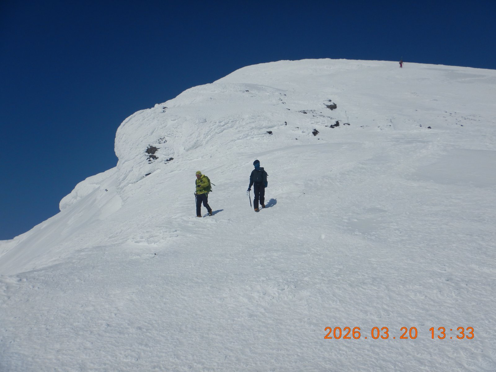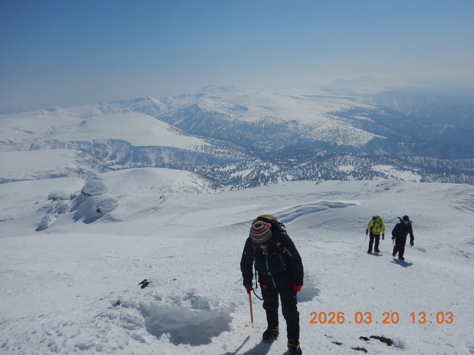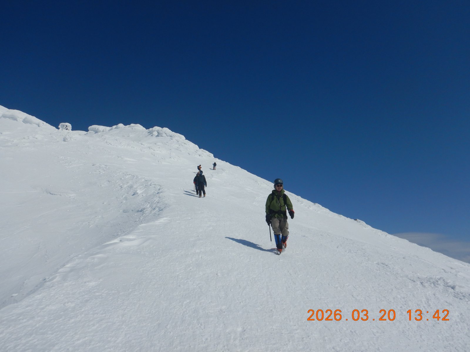 快晴の旭岳 その2 S 2026年3月21日(土) 14:54 写真を少々追加 ピークは近いが疲れもピークか。 ピークは風もなく快適だったが、やはり寒い。 早々に下山開始! 下りは早い、アイゼンも気持ちよく効く
