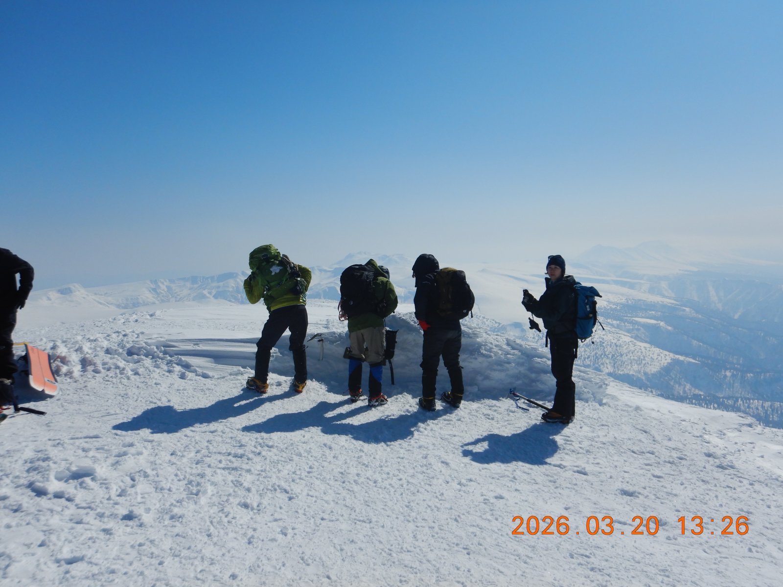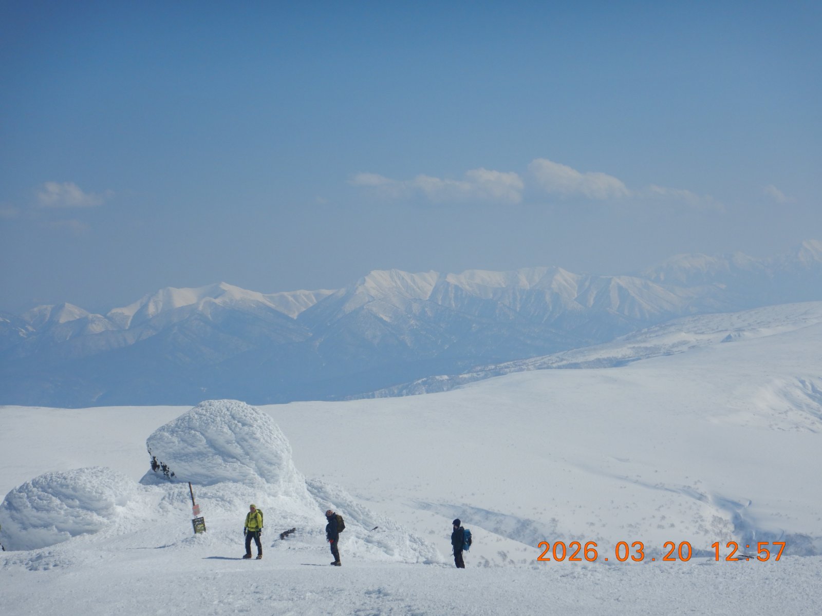 快晴の旭岳 S 2026年3月21日(土) 12:46 旭岳に行ってきた。今回はスキーが目的ではなく、足はスノーシューとアイゼン。ロープウエイが混んでいて一時間遅れの行動となったが、とにかく天気が良く、大雪山の真ん中を登っていると実感できる山行だった。スキーヤー、ボーダーの滑降シュプールも、地獄谷はじめあちこちの斜面に確認出来た。地上には春がすぐそこに近づいているが、大雪はまだまだ冬山真っ最中だった。 雲一つない青空の下、旭岳に向かう ピークは近いようで、なかなか時間がかかる・・・我々の場合 背景に忠別やトムラウシが広がる 金庫岩付近、背景は石狩岳山塊